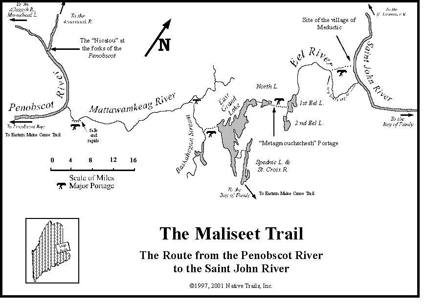 Sammy Says: "Mike Krepner's map has a special place of honor on this site, it was the first map of the Trial we found back in 2003. That year, if you "googled" Maliseet Trail, all you found were a few pages for hotels that listed the Maliseet (Hiking) Trail as a near by amenity ,and an earlier edition of Mike's map on the Davis Museum web site. You might like to know that one of Mike's canoe packs was used by Matt Hopkinson during the 2005 Crossing. I had the pleasure of tumping that pack, yes- tump line included along with conventional shoulder straps on the pack, a few kms and I can tell ya -I want one too. Contact Mike at igasisle@midcoast.com to order yours. Matt H. tells me that Mike K. powers his shop with solar power. How cool is that? Here is link to a pic of Matt showing the tumpline and shoulder straps "
