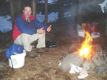 Sammy Says... "This is a picture of my paddling partner Mike taken on our last morning of the Crossing. Each dawning day would find Matt, Mike and Sammy starting the fire (in that order) and getting the coffee brewing. This was done in total self interest... "Hi my name is Sammy and I'm a coffe-a-holic"Mike of the Early Morning Coffee Trio. As Mike says "Nobody loves you like a campfire".