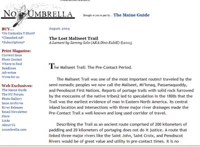 The Maliseet Trail was one of the most important routes traveled by the semi-nomadic peoples we now call the Maliseet, Mi'kmaq, Passamaquoddy, and Penobscot First Nations(1). Reports of portage trails with solid rock furrowed by the moccasins of the native tribes led to speculation in the 1800s that the Trail was the earliest evidence of man in Eastern North America(2). Its central inland location, and intersections with three major river drainages, made the Pre-Contact Trail a well-known and long used corridor of travel. Describing the Trail as an ancient route comprised of 200 kilometers of paddling and 20 kilometers of portaging does not do it justice. The Trail was an arterial route that connected the Maliseet's ancient Fort Medoctec (12 kms south of today's Woodstock, NB, Can.) to the Penobscot's Indian Island (just north of today's Old Town, ME, USA) by passing through Passamaquoddy territory and linking the drainage systems of the Saint John, Saint Croix, and Penobscot Rivers. The Trail was an important link in the original world wide waterway (www) of pre-contact Eastern North America.This Trail, like so many other waterways, supported and gave rise to that most efficient craft of superior qualities we call the birch-bark canoe. A craft which arriving Europeans adopted without modification for forest travel (3) and which, in this writers opinion, modern man has yet to equal.